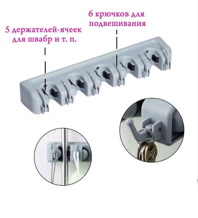Держатель для пяти хозяйственных принадлежностей (43 см) поможет вам держать в порядке всевозможные швабры и щетки, а не складировать их в углу. Удобно подвешенные на стене, они будут занимать меньше места и будут смотреться более аккуратно, находясь всегда под рукой.