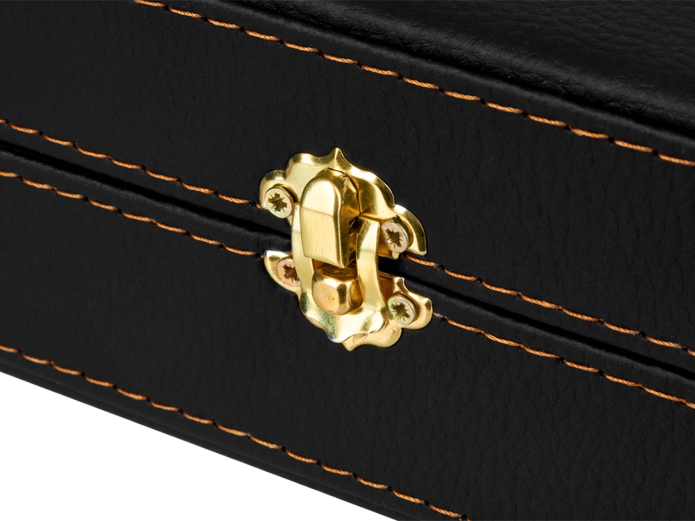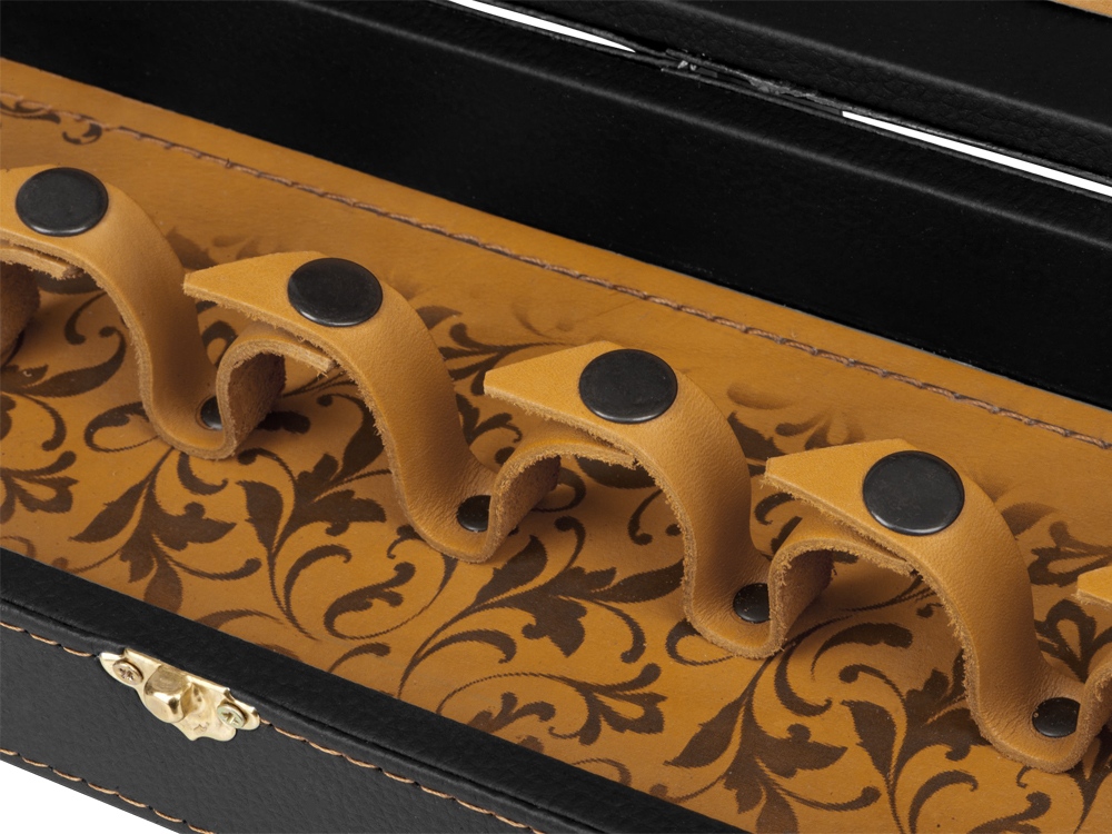 Футляр из эко-кожи, внутренняя отделка натуральная кожа рыжего цвета. Рисунок нанесен путем термообработки. В набор входит шесть стопок по 30 мл. Хрусталь, литьё.