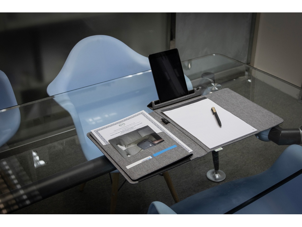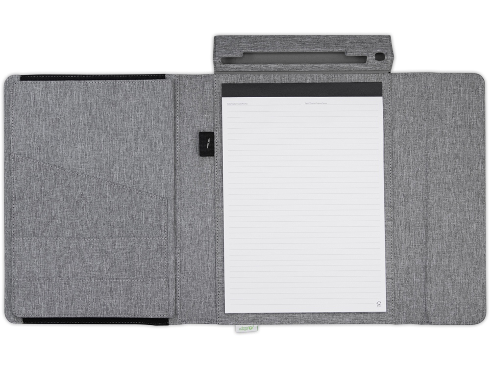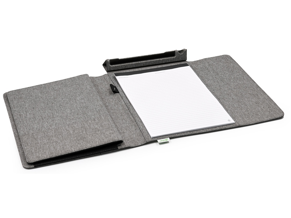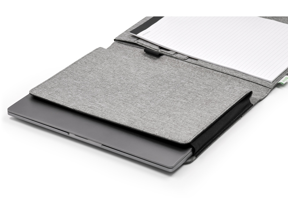 Папка-портфолио NotyFolio Eco от Brand Charger- удобный органайзер с отделением для ноутбука диагональю 13 и подставкой для телефона и ручки. Обложка выполнена из переработанного пластика (RPET). Внутри папки 20 листов FSC бумаги плотностью 80 г/м2, изготовленной с соблюдением экологических норм. Также есть петля для ручки и карманы для важных бумаг и банковских карточек и/или визиток. - плотная твердая обложка не даст бумагам помяться; - несколько карманов разного размера; - отделение для ноутбука диагональю 13; - петля для ручки; - 20 листов А4.