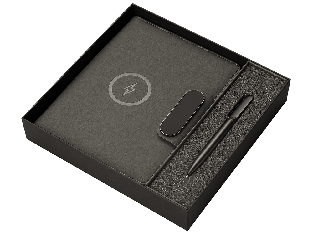 Подарочный набор Twilight — стильный и современный бизнес-подарок, который в полной мере воплощает идею многофункциональности. Он состоит из органайзера формата А5, с помощью которого можно заряжать гаджеты как беспроводным способом, так и через кабель, фиксировать телефон для просмотра видео или проведения конференций, хранить ручку и делать записи, а также самой металлической ручки. Клапан органайзера и в верхняя часть ручки светятся при гравировке логотипа, что делает набор стильным, а лого более ярким и заметным. Практичный и технологичный аксессуар, который в состоянии заменить сразу несколько вещей. - Встроенный пауэрбанк емкостью 5000 мАh. - Возможность зарядки как беспроводным способом, так и через кабель. - Удобная магнитная застежка. - Качественные материалы. - Подставка для телефона. - Блокнот для записей 64 л. - Светящийся при гравировке логотип.