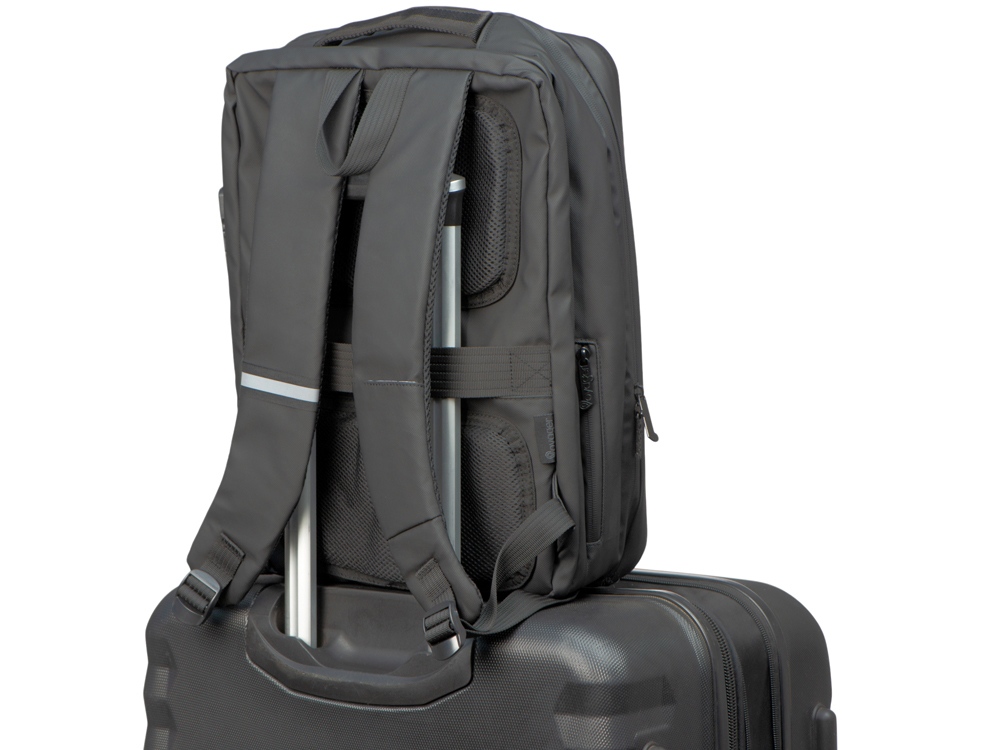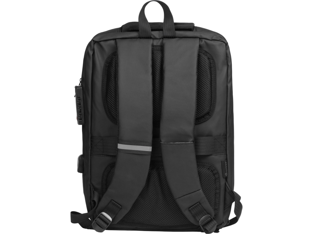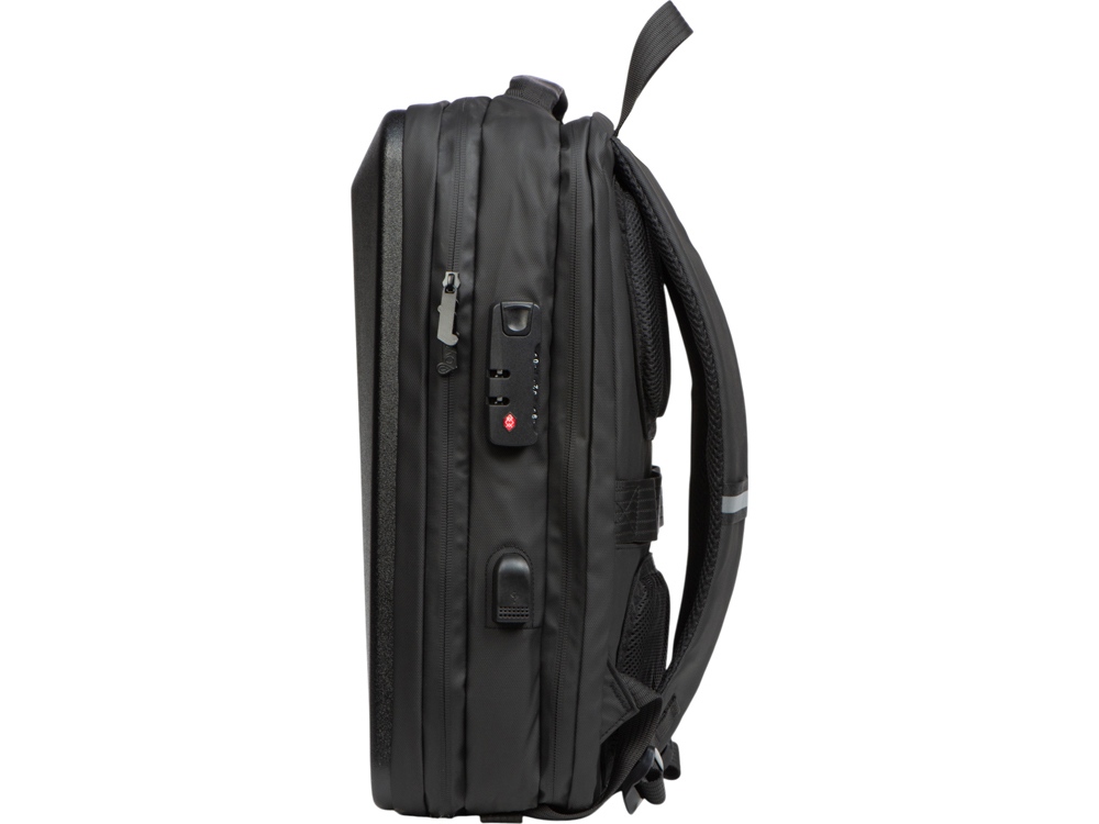 Водостойкий бизнес-рюкзак с пластиковой панелью спереди выглядит стильно и обеспечивает бережное хранение ваших личных вещей. Подходит для передвижений по городу и деловых поездок. 2 вместительных отделения позволяют разместить все необходимое: большое отделение для одежды с фиксирующими ремнями и органайзером, меньшее отделение с карманами для ноутбука и планшета и сетчатым органайзером. Несанкционированный доступ к содержимому вашего рюкзака будет затруднён благодаря кодовому замку и прочной пластиковой панели спереди. В рюкзаке предусмотрено много дополнительных удобств для использования: - интегрированный карман на молнии для бутылки сбоку - расстегнули, не снимая рюкзак, и бутылка окажется внутри корпуса - USB выход - светоотражающий элемент на лямке для большей безопасности - карман на лямке для карт, проездного или ключей - регулирующиеся по длине лямки - сетчатая спинка - ремень для крепления на ручку чемодана - нетканый мешок для хранения в комплекте - шильд для нанесения вашего логотипа в комплекте
