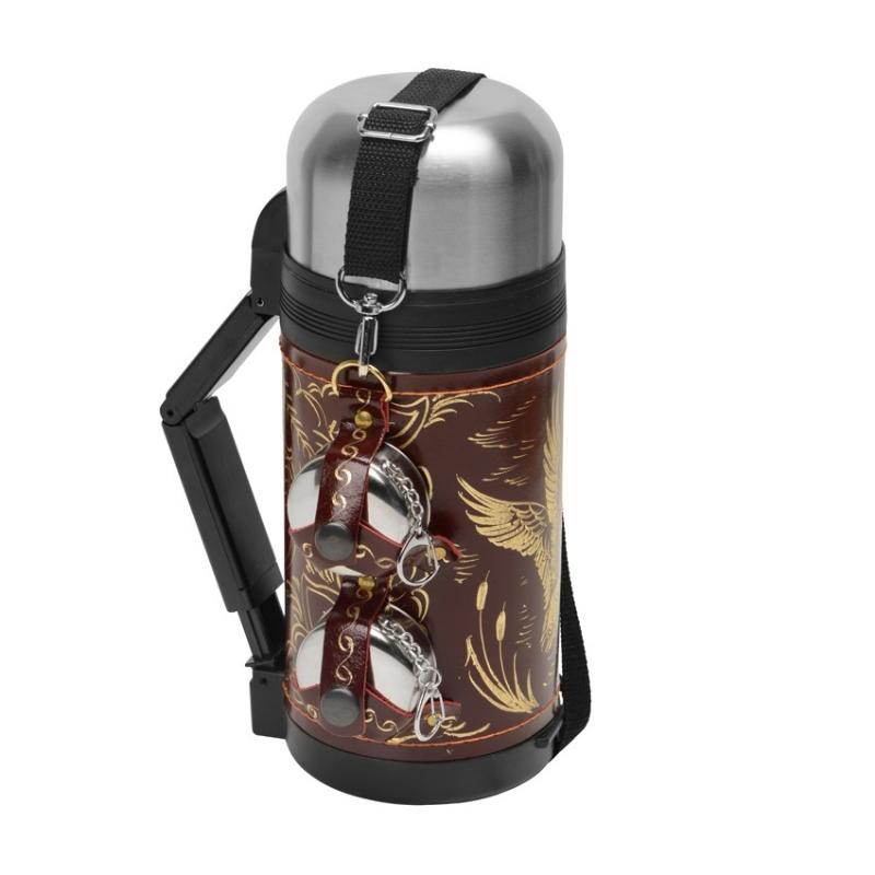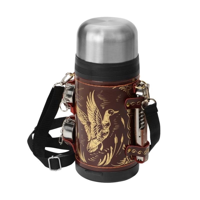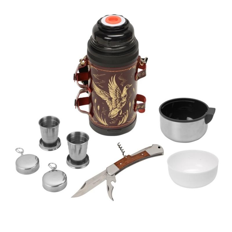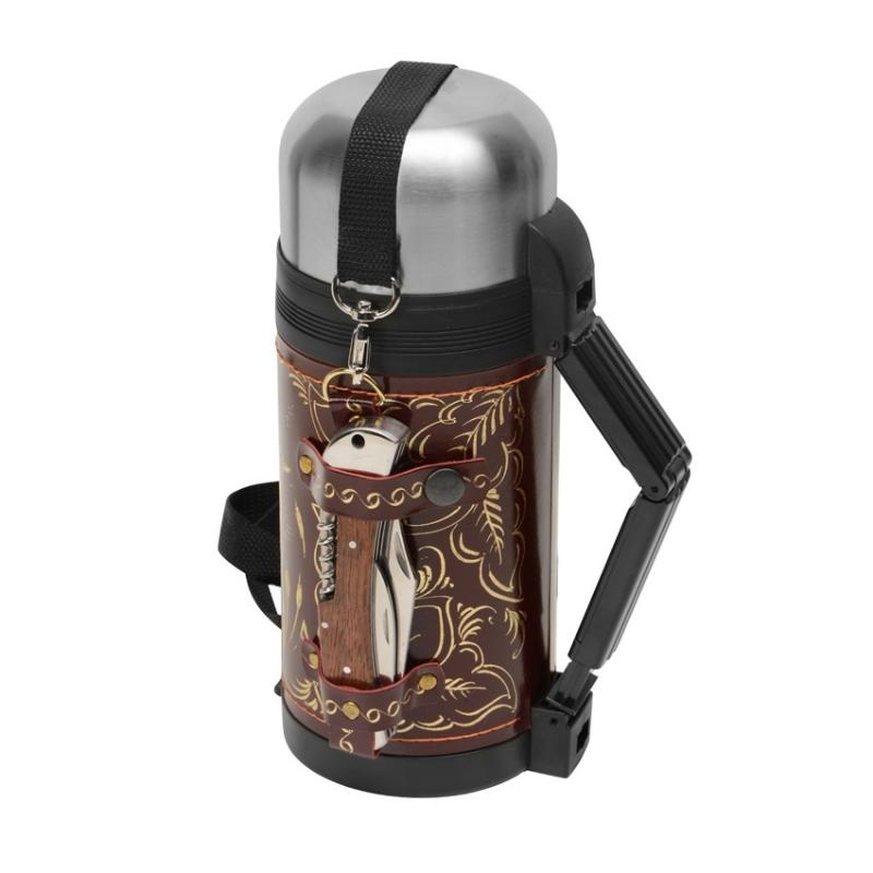 • Включает в себя термос на 1,2 л (нерж.сталь) с металлической колбой в чехле из натуральной кожи с художественным выжиганием, 2 складных стакана и многофункциональный нож